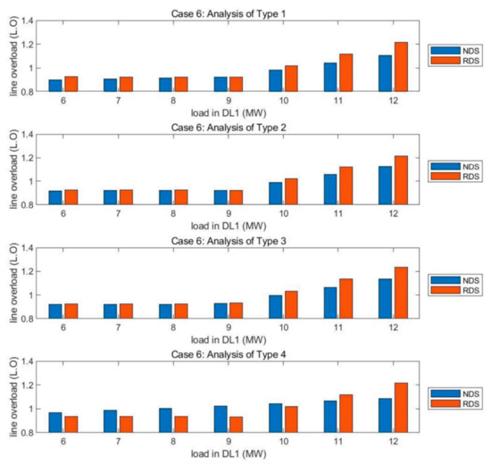 Figure 16 represents the line overload analysis results for Case 6. As shown below, line overload in NDS is relatively less volatile than that of RDS according to load change. This is because load concentration in one feeder can be dispersed to other feeders. Hence, the maximum load current does not exceed the line ratings (252 A) even when more than 10 MW per distribution line is connected. Accordingly, the probability of line overload can be reduced by introducing NDS, presenting similar results in [24], which indicates that integrating variable resources such as an electric vehicle (EV) is also advantageous in NDS.