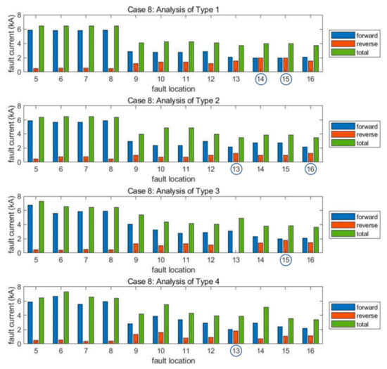 Figure 17 presents the neutral fault current analysis results of Case 8. As mentioned in Section 2.4.2, most forward fault currents are higher than reverse fault currents. In particular, when a fault occurs near a substation (#5–8), the forward fault current is dominant, and the reverse fault current is too low. Fault locations where the minimum fault current is detected are usually located near the endpoint of each feeder (#13–16). These are shown with blue round marks in Figure 17.