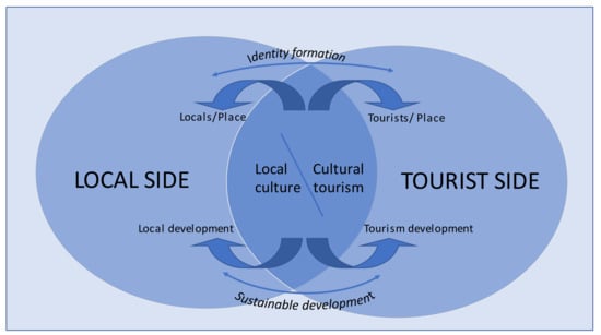 Obviously, not all tourists are (at least, consciously) seeking cultural attractions at all destinations, all the time. Most mass package holidaymakers most often seek to be part of the hybrid, celebratory resort culture or are simply happy to enjoy a commercialized, ‘manufactured’ or ‘pseudo-culture’ of the host community [19] (p. 468), otherwise MacCannell’s ‘staged authenticity’ [51]. However, cultural tourism prospects may become highly desirable and beneficial when it comes to establishing, upholding and enhancing or further developing local cultural sustainability and tourism sustainability and thus contributing to overall destination-sustainable development. Since cultural tourism represents an economic activity tightly knit with the place where it occurs, “visitor activities and services must be part of and compatible with everyday life and social activity, contributing to a sustained local sense of place and pride. Cultural and tourism products and services including events and festivals have to be consistent with the identity of places and their communities… [In this light], participatory governance through shared ownership and stewardship of cultural and natural heritage allows for new perspectives and collaborative efforts in the reorientation of practice, and it can therefore lead towards new and more resilient pathways for sustainable development” [27] (p. 7) (Figure 1). Towards this goal, albeit exploratory, our study presents and analyses weaknesses, possible pitfalls and threats and market demands, but also opportunities for future sustainable growth, at one of the world’s most popular and successful tourism destinations.