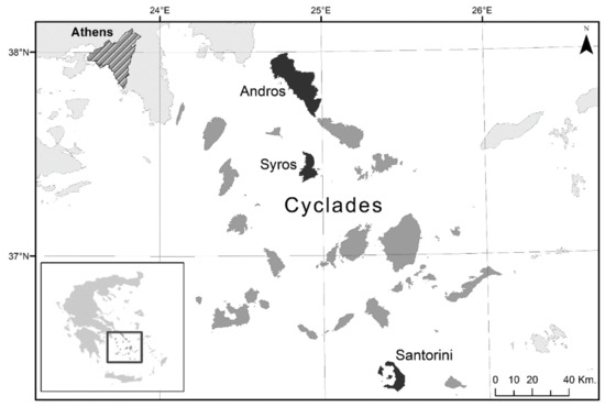 The case study location: Cyclades (Andros, Santorini, Syros). Source: Cartography and Geoinformatics Laboratory, Department of Geography, University of the Aegean.