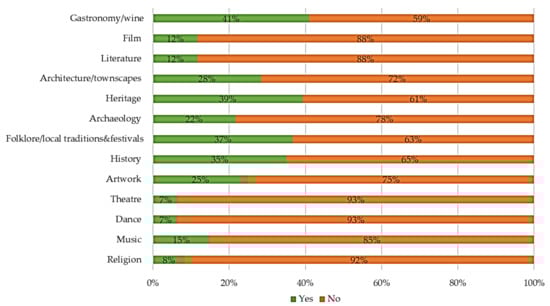 In regard to our businesses’ sample profile, the majority of businesses (85%) for all three islands were located within a radius of less than 2km of the main local cultural sites and attractions. About half (48%) of the businesses that participated in the questionnaire survey, on all three islands, were hotels and tourism resorts, followed by leisure centers and visitor-attraction types of business (27%), catering (9%) and ‘other’ types of business (16%) including tourist shops, travel agencies, museums/art galleries, etc. The majority of tourists attracted by these businesses were couples or lone travelers, and secondarily families. Special-interest tourism, the broadest and most inclusive tourism type/category, emerged as the third most important type of tourism for the surveyed businesses. Special-interest tourism in Andros referred mostly to hiking tourism, outdoor activities and the arts; in Santorini it referred to a broad variety of activities, with an emphasis on gastronomy/wine tourism; and in Syros it referred mostly to arts festivals attendance. As for the cultural services offered by the businesses in our sample, 41% of them provided gastronomy/wine, 39% offered heritage products/services, 37% provided folklore/local traditions, and the rest provided services, experiences, goods etc. in the sectors of history, architecture and art (Figure 3). A total of 83% of businesses that charged an admission fee answered that the fee was less than 25 Euros, followed by 17% of them who stated that they charged a fee of 25–50 euros.