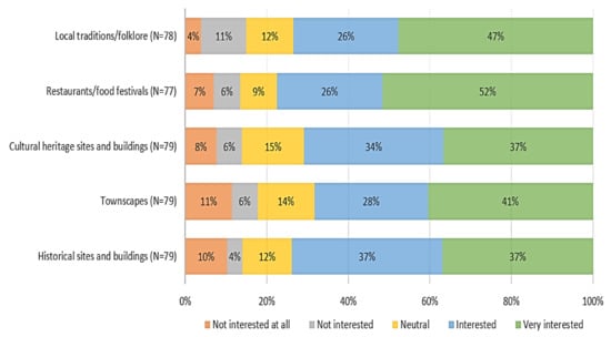 Overall, interest among the tourists who participated in our study in visiting cultural tourism attractions, events and sites, seemed to be high or very high for all categories of the variable (Figure 5). More specifically, the vast majority of respondents, both foreign and Greek, responded that they were “Very interested” (52%) or “Interested” (26%) in restaurants and food festivals or gastronomy. Large numbers of tourists also said that they were very “Very interested” (47%) or “Interested” (26%) in local traditions and folklore, followed by those who declared that they were “Very interested” (41%) or “Interested” (28%) in the townscapes of their visited destinations in the three islands of our case study. Very few interviewed tourists seemed not to be interested in any of the aspects and attractions of cultural tourism offered by the three islands. This is also very much in agreement with general statistical trends and facts concerning Andros and Syros, and even more so Santorini, as highly popular Greek (island) tourist destinations [11].