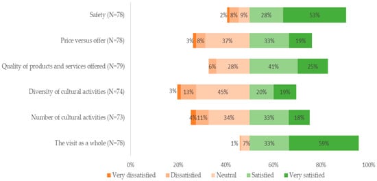 Regarding satisfaction levels with the cultural tourism aspects and attractions of the visited islands of our case study (Andros, Santorini and Syros), the vast majority of the respondents declared that they were “Very satisfied” (59%) or “Satisfied” (33%) with the visit as a whole, thus leaving a margin for improvement (Figure 6). Large numbers of the tourists participating in our field survey also declared that they were very “Very satisfied” (53%) or “Satisfied” (28%) with the provided safety conditions, followed by those who said that they were “Very satisfied” (25%) or “Satisfied” (41%) with the quality of tourist products and services offered at the destinations, indicating a certain degree of dissatisfaction and consequently implying space for improvement. However, a large number of tourists seemed to be neutral (45%) vis-à-vis the diversity of cultural activities, neutral (37%) as regards the price-versus-offer parameter and also neutral (34%) regarding the number of cultural activities provided in the area of our case study. Very few tourist answers indicated dissatisfaction with the locally provided cultural tourism aspects and attractions.