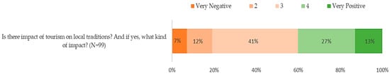 Conversely, as expected, the vast majority of our case study resident respondents (73%) stated that tourism also has an impact on local traditions (Figure 8). Most of the respondents rated this impact as neutral (41%), 12% rated it as negative and 7% as very negative, while 27% rated it as positive and 13% as very positive. Thus, overall, the impact of tourism on local traditions was considered to be positive, with lots of space for improvement.