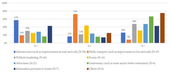 These findings are consolidated and reinforced, according to the opinions of the business representatives (question 10), by the fact and general perception that the Cyclades lack adequate and satisfactory road infrastructure and public transport [38,53,61]. The latter two aspects were rated very highly by these interviewees as necessary factors for the area’s economic improvement. Such responses showed the high degree of concern of our study participants for the state and potential of their area’s overall sustainability. It is also evident in these responses that better promotion of the islands and/or the further development of their cultural activities/attractions were also broadly thought to play a very important role towards economic improvement and thus both cultural and overall local sustainability (question 10). These results were further consolidated and verified with the aid of two additional open-ended questions, as follows.