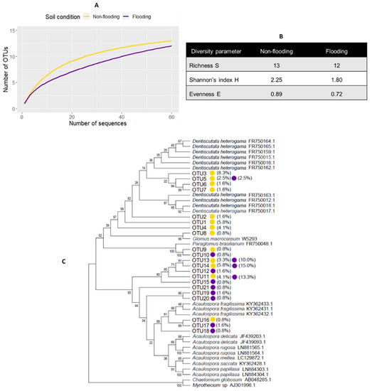 AMF OTUs detected in rice roots grown in non-flooded and flooded conditions. Rarefaction curves were analyzed from the SSU-ITS-LSU sequences of Glomeromycota amplified from rice roots grown in both conditions (A). Diversity indices between the two different conditions were summarized in Table (B). Phylotaxonomic analyses of representative AMF OTUs and their closest sequence similarity from the Maarjam and NCBI databases were constructed from the SSU-ITS-LSU sequences of mycorrhizal rice roots grown under non-flooded (●) and flooded (●) conditions (1000 bootstrap). GenBank accessions are placed behind AMF species reported in the databases. Relative abundances of AMF OTUs are demonstrated in percent with parentheses (C).