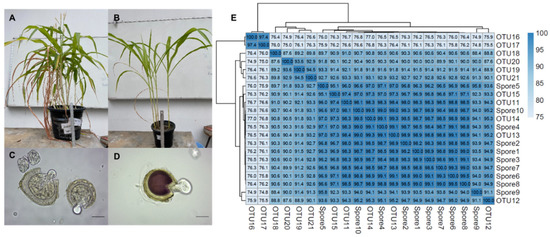 Trap culture of indigenous AMF spores. The trap culture using maize plants was prepared from organic rice paddy soil and sterile sand at a ratio of 1:3 (A). Later, Acaulospora spores were isolated based on their spore morphology for the monospore culture (B). The Acaulospora spores were mounted in polyvinyl alcohol–lactic acid–glycerol solution (C) and Melzer’s reagent (D), visualized under a bright field microscope. Scale bars represent 30 µm. The heatmap displays percent similarity of the SSU-ITS-LSU sequences from the Acaulospora spores and the representative Acaulospora OTUs from the rice roots (dark blue represents most similar and light blue less similar) (E).