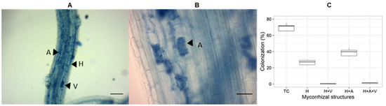 - Ho-Plágaro, T.; Tamayo-Navarrete, M.I.; García-Garrido, J.M. Histochemical Staining and Quantification of Arbuscular Mycorrhizal Fungal Colonization BT. In Arbuscular Mycorrhizal Fungi: Methods and Protocols; Ferrol, N., Lanfranco, L., Eds.; Springer: New York, NY, USA, 2020; pp. 43–52. ISBN 978-1-0716-0603-2. [Google Scholar]