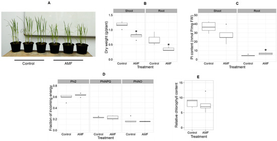 Effect of AMF inoculation on rice growth performance. Rice seedlings were grown for 6 weeks in sterile soil recolonized with a microbial wash (control) and with the Acaulospora inoculum (AMF) (A). The box plots show the distribution of shoot and root dry weight (B), shoot and root Pi content (C), fraction of incoming energy consisting of Phi2, PhiNPQ and PhiNO (D), and relative chlorophyll content (E) (n = 5 biological replicates). Statistical analysis was performed by Student’s t-test. Asterisks indicate significant differences between the control plants and the AMF-treated plants (p < 0.05).