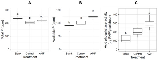 Effect of AMF inoculation on soil P availability. The box plots show the distribution of total P (A), available P (B) and acid phosphatase activity (C) in non-inoculated soil without rice seedlings (blank), non-inoculated soil (control) and AMF-inoculated soil (AMF) (n = 5 biological replicates). Statistical analysis was performed by One-way ANOVA following LSD. Different letters indicate significant differences among the treatments (p < 0.05).