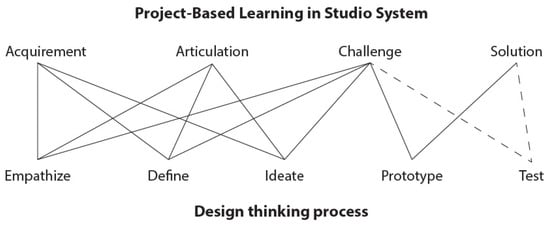 The above paragraph mentioned that design education often lacks a clear framework and design-thinking procedure. Research conducted by Oxman (2003) indicated that most design schools rarely, if ever, treat the cognitive processes of design thinking as a form of explicit teaching content [17]. However, design thinking reflects the complex process of inquiry and learning, which involves performing in a systematic context, decision-making, and collaborative working [31]. Figure 2 describes the state of the design-thinking stage while students are conducting a design studio with project-based learning (Figure 2). It explains that students need to keep going back and forth in the design-thinking stages in most phases. These factors also make teaching design difficult. Thus, we created a hypothesis of applying a clear framework for students to work on a design project and measure the effectiveness.