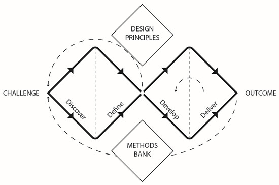 Banathy (2003) stated that design manifests dynamic interaction between feedback and feedforward, refection and creation, and divergence and convergence. The dynamics of divergence and convergence form a double-diamond relationship in the design process [33]. The UK Design Council later applied this double diamond to define the Framework for Innovation (Figure 3), which consists of four steps: discover, define, develop, and deliver. The first diamond includes discover and define. The discovery phase is for people to understand what the problem is, rather than assume what it is. After gathering insight during the discovery phase, people need to define the challenge. The second diamond consists of develop and deliver. The developing phase engages people to provide different answers to the clearly defined problem, while the delivery phase involves testing out solutions and evaluating outcomes to create innovative solutions [34]. The diagram is not necessarily shown as a linear process but can bring the process back to the beginning to identify underlying problems.