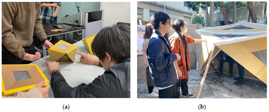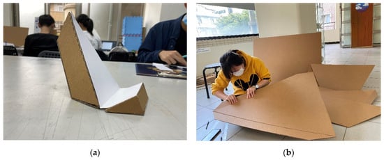 As the medium for developing projects, we selected corrugated cardboard. The strength of this material is flexible and easy to edit without professional knowledge. It comes in standardized dimensions, with different thicknesses, such as 1, 3, 5, and 8 mm. These different thicknesses help students think with smaller and larger prototypes and quickly test their ideas. Students used 1 mm cardboard to make 1:5 scale models, as well as 5 mm–thick cardboard to complete full-scale furniture prototypes for the first assignment (Figure 4). Afterward, students used 3 mm–thick cardboard to build 1:10 scale models, as well as the 8 mm–thick cardboard to construct the final full-scale shelter (Figure 5). We also informed the students that there is a well-developed paper-recycling system in Taiwan. Most of the cardboard waste can be recycled into other paper products [35]. We encouraged our students to think not just about the design of the product but also about the lifespan and the end of the product’s life.