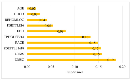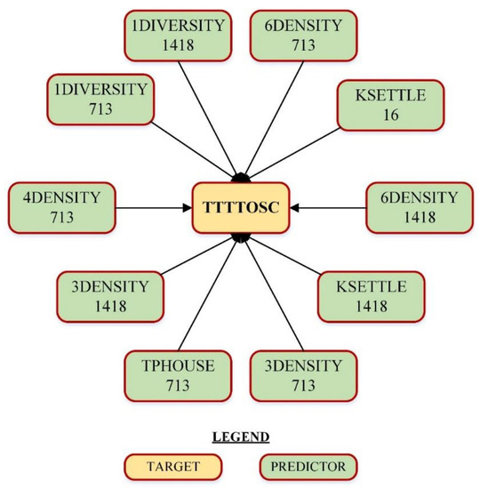 The first BN model was developed using 27 BE variables that were chosen in the previous step. This model selected the 10 most important variables to predict the TTT of university students to campus. The training accuracy of this model was 97.47%. The BN#1 structure is presented in Figure 4. This diagram includes 11 variables, 10 predictors, and 1 target variable. The importance of each predictor is shown in Figure 5. As evidently shown, the availability of residential buildings in the neighborhood that respondents lived in, within the age period of 14–18, was the most critical predictor. This predictor was followed by the proximity of the house to shops in the age range of 14–18. The least essential predictor was the type of settlement in the age period of 14–18. As analytically revealed, settlement type in the age range of 1–6 was more critical than 14–18. From the age group perspective, settlement type was the only factor that was assessed by this study for the age range of 1–6. This predictor was selected as an essential predictor by the BN. For the age range of 7–13, four predictors were the most important, which are: (1) availability of residential buildings in the neighborhood, (2) availability of schools in the neighborhood, (3) availability of entertainment facilities in the neighborhood, and (4) proximity of the house to shops. For the age range of 14–18, four predictors were the most important, which are: (1) availability of residential buildings in the neighborhood, (2) availability of schools in the neighborhood, (3) proximity of the house to shops, and (4) settlement type.