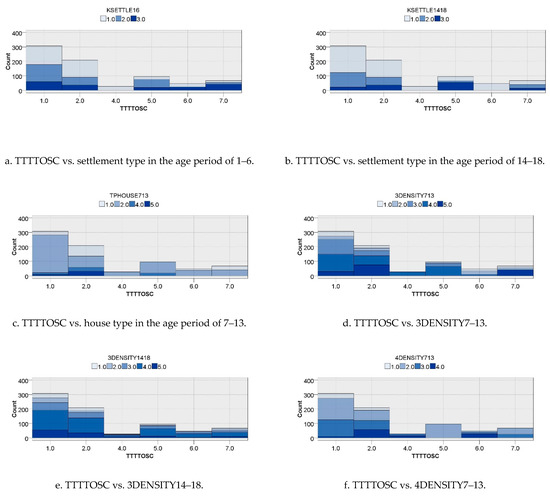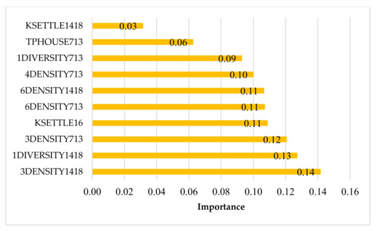 The importance of BE variables for predicting the TTTs varied by age period. For example, for settlement type, the age periods of 1–6 and 14–18 were important while the age period of 7–13 was not. However, it is necessary to remark that this conclusion does not suggest that settlement type in the age period of 7–13 was not important at all but that it was less significant than other age periods for predicting the TTT of university students to campus. For those variables that were important in both the age periods of 7–13 and 14–18 (1DIVERSITY, 6DENSITY, and 3DENSITY), it could be argued that these variables would play a significant role in developing the future students’ travel behavior and constantly affected the development of their travel habits and preferences. Arguably, availability of shops near the respondents’ past houses and availability of residential buildings, entertainment facilities, and schools in the respondents’ past neighborhoods may influence other future travel behaviors of people.