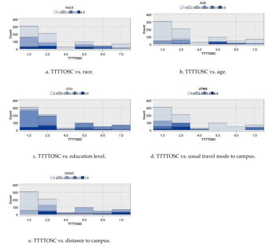 With regards to the controlled variables, race, age, and education level of students were selected as the critical sociodemographic variables to predict the TTT of university students to campus. Additionally, this present study identified the usual travel mode and distance of the school from home as important predictors of TTT of university students. However, no previous studies have assessed the impacts of such variables on TTT of university students. He, Zhao, and He [30] found the significant impacts of age, education level, and travel mode on tolerance threshold of commuting time of the general population to be important variables. Besides, the contribution of sociodemographic factors and travel mode to the TTT of the general population was confirmed in Páez and Whalen [89] and Redmond and Mokhtarian [90].