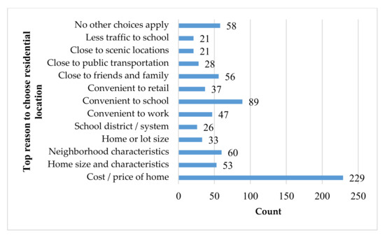 A summary of TTTs by important control variables is presented in Figure 9. This study assessed whether any significant difference among TTTs exists regarding race, gender, education level, usual travel mode to campus, and distance to campus. Calculations obtained showed that differences in age and distance to campus significantly resulted in different TTTs (p-value = 0.008 and 0.000, respectively). The results indicated that the majority of younger students prefer to choose shorter TTTs. On the other hand, older students were inclined to select longer TTTs, such as 41–50 min. While the majority of students who lived closer to their school chose shorter TTTs, the students who lived far from the school (more than 51 km) selected longer TTTs (more than 60 min). Figure 10 shows principal reasons for selecting the current houses by university students which provide a deeper insight into the factors that influenced university students’ residential choices.