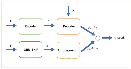 The autoregressive component is implemented by a linear layer, where is the weight matrix, is the bias term, and is the target series. The prediction target at time T can be divided into three parts: periodic part, linear-part and non-linear part. The output of the decoder is the forecast of the non-linear part, and the output of the GRU-SKIP component is the forecast of the periodic part and the linear part. So, the final prediction value is the sum of and :