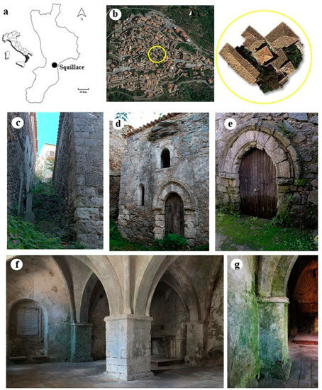 Study site: (a) localization of Squillace (Calabria, South Italy); (b) aerial view of the old village—the square roof of the building is visible in the center of the yellow circle; (c) south façade; (d) detail of east façade; (e) main entrance on north façade—rising damp phenomenon is visible on the door; (f) internal room; (g) detail of the south wall where biological patinas are visible.