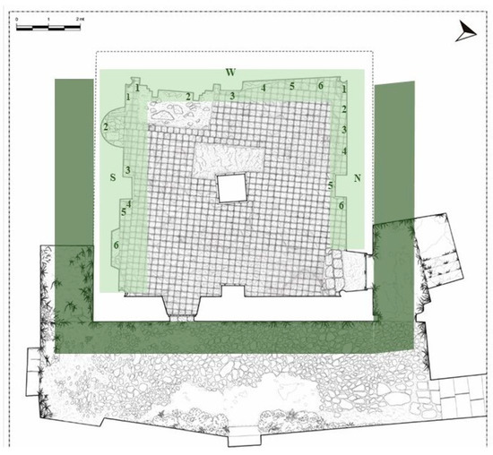 Plan of Santa Maria della Pietà building (Giannotti, 2003) with sampling map. Light green underlines the internal sampled walls (N = north; S = south; and W = west) with biofilm sampling points. Dark green underlines the external area where higher plants were detected.