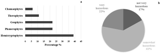Life form spectrum of plant species detected, following R classification system (a), and amount in percentage of plant species following Hazard Index (b).