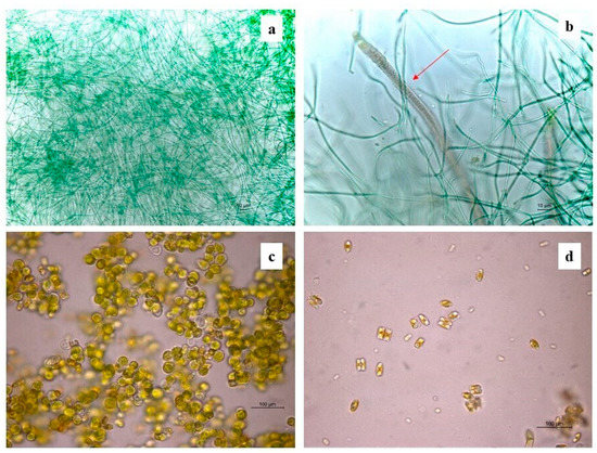 Some identified phototrophic taxa under the optical microscope: (a) Leptolyngbya; (b) Schizothrix (red arrow); (c) Chlorella; (d) Eunotia.