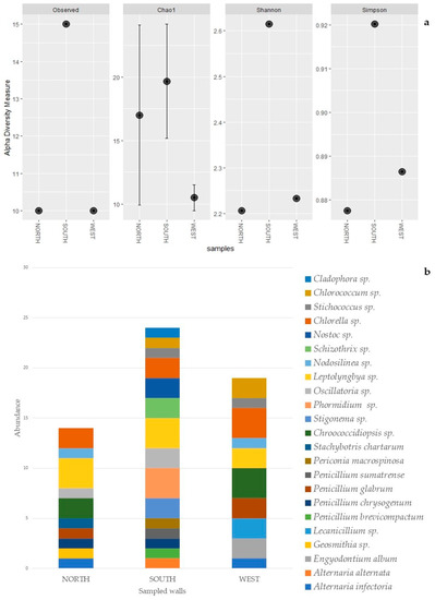 The alpha diversity analysis highlighted higher biodiversity values on the southern-oriented wall (Table 5). The different index values show similar diversity patterns, except for the Chao 1 index, where the north-oriented wall highlighted a higher value compared to the western wall (Table 5). However, this higher value is accompanied by a wider variance. In fact, this index, rather than the Shannon and the Simpson indexes, is more affected by single taxon observations (singleton) [93]. Chao 1 index results are visible in the abundance bar plot (Figure 5), which, with the same number of taxa, clearly shows higher amounts of singletons for the northern wall compared to the west wall. The higher amount of alpha diversity on the southern wall suggests that a potentially more favorable orientation, combined with several environmental conditions, such as the higher amount of light, may have facilitated the colonization of this wall by more taxa. However, further investigation and a bigger sample size would allow for a more comprehensive picture.