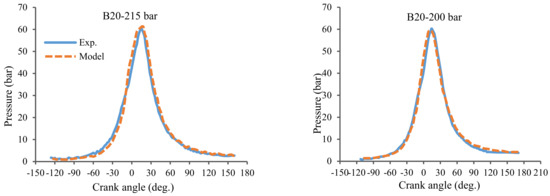 Figure 2 demonstrates the simulation and experimental in-cylinder pressure data for the B20 fuel at 200 and 215 bars and 1600 rpm. The results show that there is a good correlation between the simulation and experimental data. Regarding the strong correlation between the experimental and simulation data, the exergy terms are computed for different biodiesel–diesel blends at two IPs at 1600 rpm.
