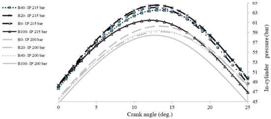 The in-cylinder pressure levels at 200 and 215 bar IPs for various fuels are illustrated in Figure 3. With increasing the IP, in-cylinder pressure increases for all fuels. Rising IP leads to better spray atomization and penetration, resulting in better mixture formation and combustion process. The appropriate mixture leads to more energy release throughout the combustion process, and, hence, in-cylinder pressure increases [36,37].
