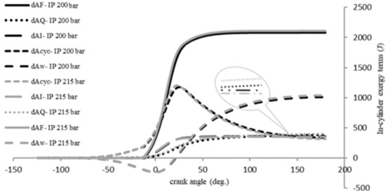 The exergy of different parameters at 200 and 215 bar IPs for B0 fuel is shown in Figure 4. The indicator exergy at IP = 215 bars is more than that for 200 bars because the in-cylinder pressure at 215 bars exceeds that for 200 bars. In addition, burned fuel exergy at 215 bars is slightly higher than that of 200 bars because of the improvement in the atomization of the fuel injection into the cylinder and an increase in the flame speed at higher IPs [38]. The exergy transfer by heat at 215 bars is higher than that of 200 bars because the in-cylinder temperature at 215 bars is more than the temperature at 200 bars. The irreversibility at 200 bars pressure is slightly more than that of 215 bars due to a decrease in in-cylinder temperature at this IP [39].