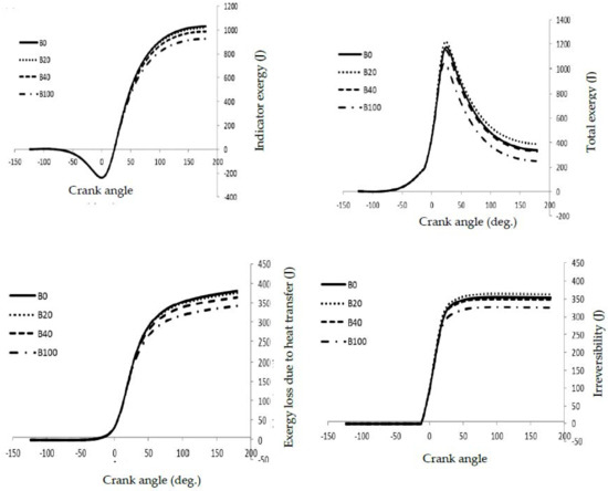 The impact of different fuels on various exergy parameters is shown in Figure 5. It can be observed that the exergy indicator (heat transfer exergy) of B0 and B20 fuels is more than that of B40, and the exergy of B40 is more than that of B100. This can be attributed to a decrease in in-cylinder pressure as a result of raising the content of biodiesel in fuel blends because of the lesser heat value of the biodiesel fuel. Burned fuel exergy of B20 fuel exceeds that of B0 fuel. Although B20 yields less heat value than B0, the B20 fuel includes oxygen in its chemical structure, and it causes better combustion and consequently higher chemical exergy and burned fuel exergy [40]. Moreover, because of its low heat value, the burned fuel exergy of B100 fuel is considerably less than that of other fuels. Because of high exergy loss due to heat transfer and chemical exergy, the irreversibility rates of B0 and B20 fuel are higher than that of other fuels.