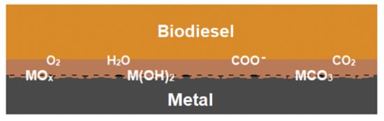 In the utilization of UCOs, corrosivity during storage and usage are some of the concerns yet to be investigated for addressing materials compatibility issues with the UCOs. According to the experimental investigation of Fazal et al. [9], on the surface of metals exposed to biodiesel as well as water and oxygen at room temperature and for different periods, corrosion products consisting of metal-oxides, -carbonates, and -hydroxides can be formed. Figure 1 illustrates the overall phenomena at the interface of a metal and biodiesel as described in literature [9]. Despite the compositional differences between UCO and biodiesel, the same phenomena depicted in Figure 1 could occur also at metal/UCO interfaces under similar conditions.