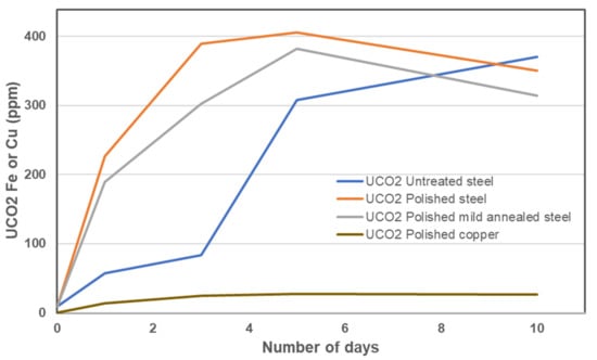Changes in iron and copper concentrations dissolved from untreated and polished steel rods, polished mild annealed steel rods, and polished copper rods into UCO2 as a function of exposure time. The cumulative error for the measured values is 3%.