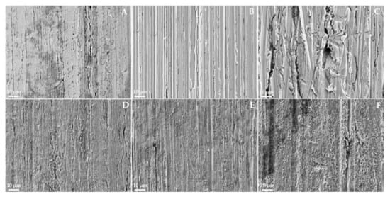 SEM images before oil exposure of (A) untreated steel, (B) polished steel, and (C) polished mild annealed steel. SEM images after 10 days of exposure to UCO2 (D) untreated steel, (E) polished steel, and (F) polished mild annealed steel.