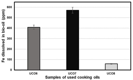 UCO2, UCO6, and UCO7 dissolved a high iron concentration (200–600 ppm). For UCO6 and UCO7, the water content was the highest, between 3100–3750 ppm, and for UCO2, the water content was 1800 ppm, which was also close to the maximum approved level of 2000 ppm of water in oil [10]. The ANs were 6.5–6.9 mg KOH/g oil, which was lower compared to UCO5 and UCO8 samples’ ANs (8–8.8 mg KOH/g oil).