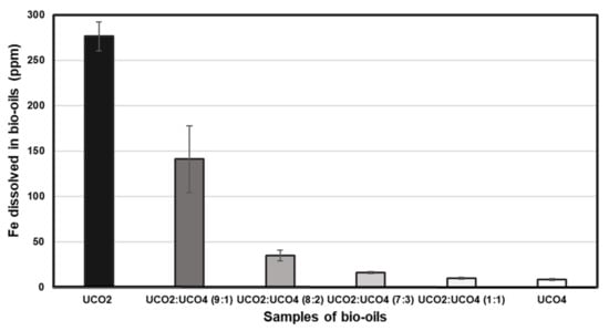 The more corrosive UCO2 was mixed with the low corrosive UCO4 in fractions of 9:1, 8:2, 7:3, and 1:1. The immersion test during 3 d with a polished steel rod was implemented. Three replications for each sample were performed. Figure 5 shows the iron concentrations dissolved in the oils. When UCO2 was used in the immersion test, an average iron concentration of 277 ppm was dissolved. As the fractions with decreasing concentration of UCO2 were tested, the concentration of dissolved iron in oil also decreased. The results show that by adding the low corrosive UCO4 oil to a very corrosive UCO2 oil, the harmful corrosive properties of the bio-oil mixture decreased. For utilization of different UCO batches, it would be very important to know the quality of each batch. The most corrosive batches should be blended with the less corrosive batches in a certain proportion such that the influence of the more corrosive oils is minimized.