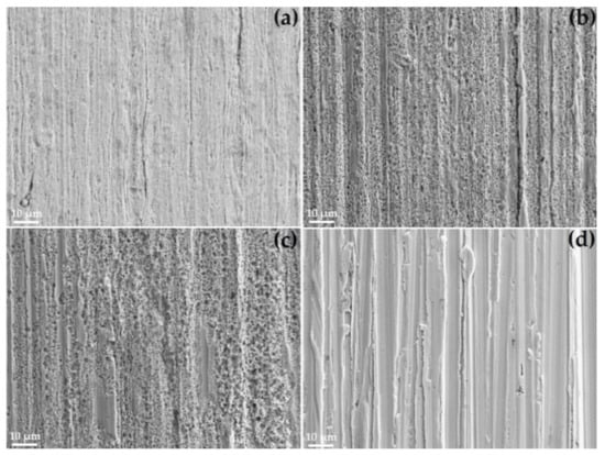 SEM secondary electron images of polished steel rod surfaces after 3 days of exposure to: (a) UCO2, (b) UCO2:UCO4 (9:1), (c) UCO2:UCO4 (8:2), and (d) UCO4.