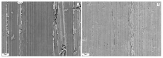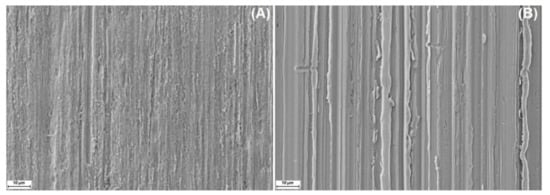 SEM secondary electron images of polished copper rod surfaces: (A) not exposed to the bio-oil and (B) exposed to UCO2 for 5 days.
