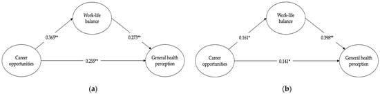 As anticipated by the patterns found in the correlation matrices, the two models differ significantly. For males, career opportunities are positively related to work–life balance (β = 0.365 **, se = 0.07) and general health perception (β = 0.255 **, se = 0.06); work–life balance also positively relates to general health perception (β = 0.273 **, se = 0.06). Career opportunities act on a positive general health perception directly and indirectly through a good perception of the work–life balance. For females, career opportunities are positively related to work–life balance (β = 0.161 *, se = 0.08) and general health perception (β = 0.141 *, se = 0.06); however, values are significantly lower compared to the male counterparts. On the other hand, work–life balance is positively related to general health perception (β = 0.398 **, se = 0.06) to a greater extent compared to the male sample. Career opportunities act on general health perception directly and indirectly through the effect of work–life balance. The latter shows a stronger relationship with general health than the career opportunities perception. We can conclude that both H1 and H2 are confirmed. Indirect effects values are shown in Table 3.
