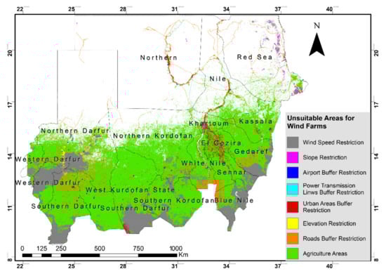 The overall unsuitability raster map is displayed in Figure 4, revealing the unfavorable zones in the southern part of the Sudanese territory. The outcomes signify that 48.20% of the total land area (893,678.61 km2) is unsuitable for establishing wind farms, while the others have no restrictions and are nominated as possible locations to install wind farms. The major occasions behind this can be demonstrated from the unsuitability map, which reveals that most of these lands are agricultural areas where wind farms cannot be established. Additionally, the wind speed activity is very low (less than 3 m/s) in most southern parts of the country and the western section. The west section of the country also has elevation restrictions since it contains mountains and hills higher than 1 km, and roads and airports buffer restrictions.