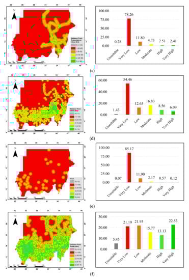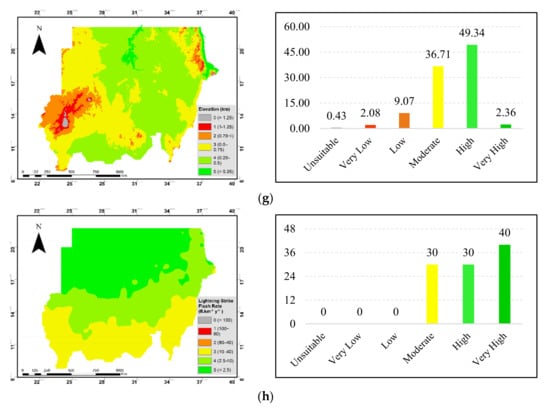 Furthermore, the distribution map of different lightning strikes levels in Sudan has been generated using the reclassifying tool in ArcMap for the LIS/OTD Total Flash Density Map. The reclassification process is conducted according to selected ranges in Table 4; the map is resampled to a resolution of 250 m. In addition, the classification map of distance from urban areas has been generated using LULC map and extracts the urban areas using “extract by value” tool then the map has been converted to polygon and the “buffer” tool has been used to determine the different distance buffers. Additionally, the buffer tool has been used to develop the distance from the road network and distance from power transmission lines using the maps provided by the open street map website.