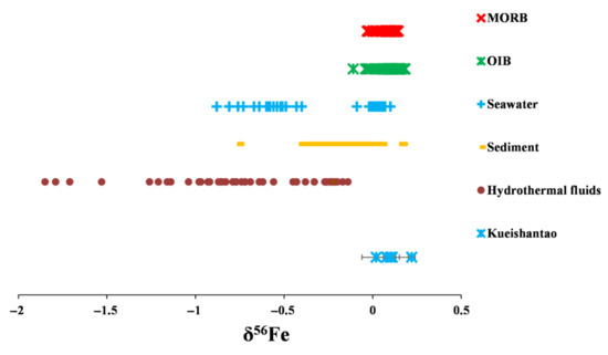 The δ56Fe distribution of KHF andesites. For comparison, the δ56Fe range of MORBs [33], OIB [33,34], seawater [35], sediment [36,37], and hydrothermal fluids [1,37,38,39] are also shown.