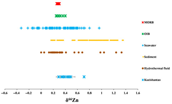 The δ66Zn distribution of KHF andesites. For comparison, the δ66Zn range of MORB [44,45,46], OIB [46], seawater [42,47,48], sediment [15,49], and hydrothermal fluids [6] are also shown.