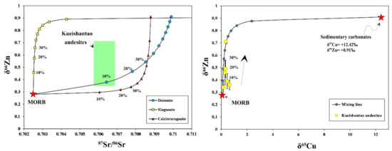 The data of Zn isotopic composition, the Zn and Sr contents, and the 87Sr/86Sr ratio of MORB, dolomite, magnesite, and calcite/aragonite are taken from [57]. The Sr, Cu, and Zn isotope ratios range of Kueishantao andesites are from [25] and this study. The Cu content (2.28 ppm) and Cu isotope composition (+12.42‰) of sedimentary carbonates were estimated from [73,74]. The Cu content and isotope composition of MORB are from [5,75]. Mixing hyperbolas are marked in 10% increments.