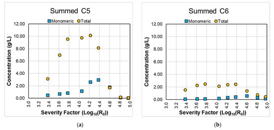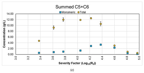 Summed concentrations of C5 and C6 sugars for the different LHW pretreatment conditions. Summed C5 (a), C6 (b), and C5 + C6 sugars (c).