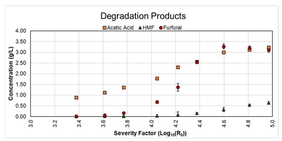Figure 2 shows the concentrations of degradation products reached under each studied condition. The analysis of these components is relevant as they may condition future usages of the hydrolysates as a substrate for fermentation. We observed a steady increase in the concentration of acetic acid until a severity factor of 4.60 (200 °C for 30 min). Acetic acid is produced from the release of the acetyl groups connected to the hemicellulose matrix. This suggests that hemicellulose is hydrolyzed until the above severity factor is reached. However, even with the maximum acetic acid concentration reached in this work, ~3.2 g/L, the concentrations are below reported thresholds at which acetic acid inhibits microorganism growth (e.g., 7.5–15.0 g/L for yeast growth [29,30]).