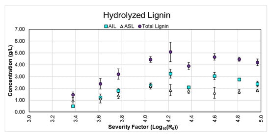 Concentration of hydrolyzed lignin for the different LHW pretreatment conditions tested. AIL: Acid Insoluble Lignin; ASL: Acid Soluble Lignin. Total lignin corresponds to the sum of AIL and ASL.