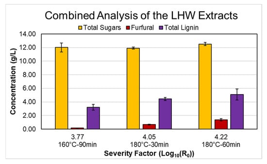 This section focuses on integrating the results obtained in the previous sections. For this purpose, we will use the most relevant values from each section. To evaluate the extraction of sugars, we will take as base the total summed C5 + C6 sugars, as it was shown that the potential use of the LHW hydrolysate as fermentation substrate should be for microorganisms metabolizing both monomeric/oligomeric C5 and C6 sugars. We performed the analysis for the three conditions that reached higher total summed C5 + C6 sugars (160 °C for 90 min, 180 °C for 30 min, and 180 °C for 60 min). We observed that furfural was the component that reached critical concentrations at a lower severity factor when analyzing the degradation products. Therefore, we will use the concentration of furfural as the decision criteria. Regarding lignin extraction, we will use the total lignin extracted, given that this value reflects the entire amount removed from the solid matrix at given conditions. Figure 4 shows the combined results of total sugars, furfural, and total lignin for the three sets of conditions that allowed the higher total concentration of sugars.