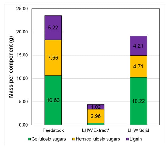 Absolute mass balance for cellulose, hemicellulose, and lignin in the feedstock, LHW extract, and the solid leaving the LHW stage for the LHW carried out at 160 °C for 90 min. * Cellulosic sugars for the LHW Extract are 0.41 g.