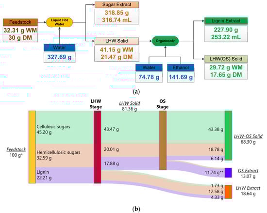 Mass balances and distributions of the streams for the theoretical LHW-OS combination. (a) General mass balance of the LHW and OS stages. (b) Distribution of cellulose, hemicellulose, and lignin along the stages of the theoretical LHW-OS combination. * Feedstock composition only corresponds to the amount of cellulose, hemicellulose, and lignin. ** The amounts of cellulose and hemicellulose in the OS extract are below 1.2 g and cannot be visualized adequately in the figures.